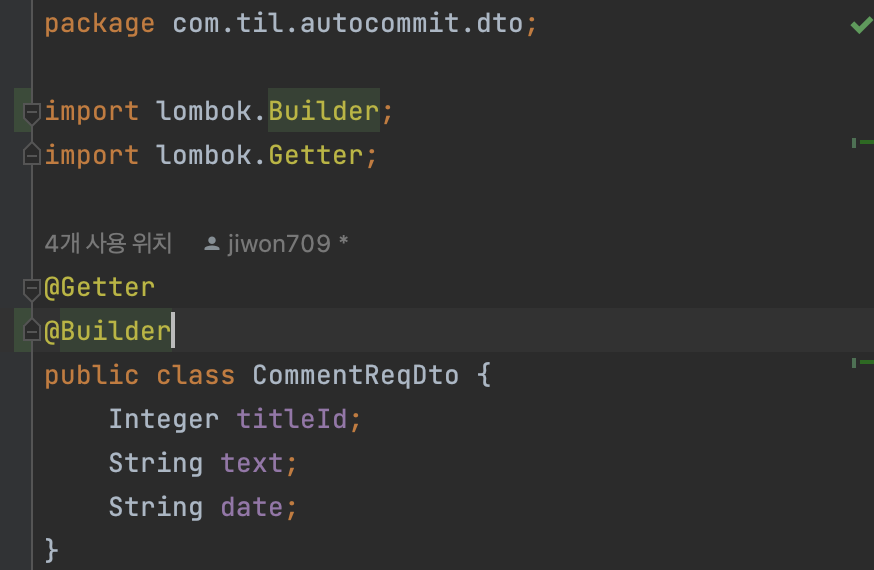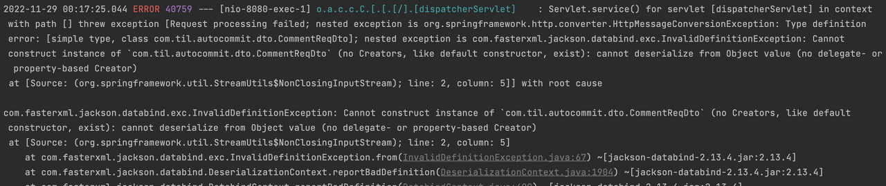 RequestDto에 Builder를 써줄 필요는 없었지만, 어쩌다가 썼다가 발생한 에러.